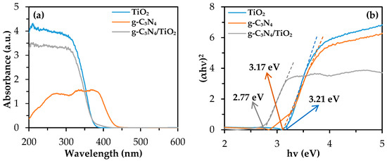 (a) DRS spectra and (b) Tauc plot of TiO2, g-C3N4, and g-C3N4/TiO2 photocatalysts.