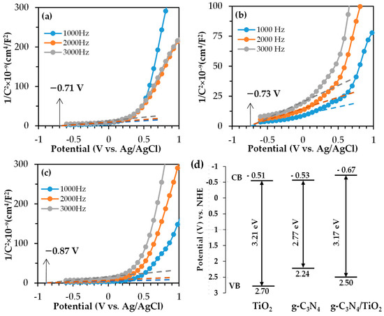 The flat-band potentials of TiO2, g-C3N4, and g-C3N4/TiO2 were −0.71 V, −0.73 V, and −0.87 V, respectively (V vs. Ag/AgCl; sat. KCl at pH 7). The value was further converted to −0.53V, −0.53 V, and −0.67 V, respectively, using Equation (2), which was V vs. the standard hydrogen electrode (NHE) (Figure 4a–c). Based on a previous report, n-type semiconductor materials have a CB potential of approximately 0.1 eV lower than the Efb [36]. Therefore, the conduction band positions of TiO2, g-C3N4, and g-C3N4/TiO2 were −0.41 eV, −0.43 eV, and −0.57 eV, respectively.