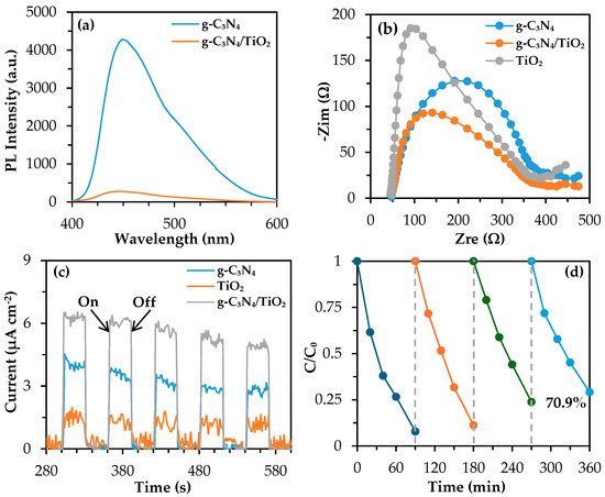 The findings from the PL and photocurrent analyses demonstrated that the prepared g-C3N4/TiO2 heterojunction enhanced the separation of photogenerated electron–hole pairs and delayed their recombination, which showed superior photocatalytic activity.