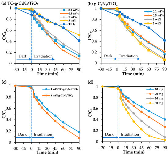 Effect of (a) TC−g-C3N4 and (b) g-C3N4 amounts during composite formation on the photocatalytic decolorization of Orange II. Comparison of (c) 1 pure g-C3N4 and TC−g-C3N4 composite. (d) Effect of photocatalyst loading on photocatalytic decolorization with 1 wt% g-C3N4/TiO2.