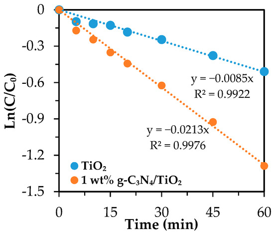 Ln (C/C0) versus time in photocatalytic decolorization with 1 wt% g-C3N4/TiO2.