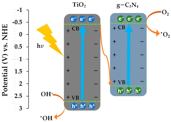 When exposed to light illumination, the VB electrons of TiO2 particles and g-C3N4 become excited, moving to their respective CB while leaving holes in their VB [15,43,44]. This process led to the formation of photogenerated electron–hole pairs in both the TiO2 particles and g-C3N4 (Figure 8). The photogenerated electrons from the TiO2 particles were transferred to g-C3N4 and combined with the photogenerated holes present in g-C3N4. This arrangement left photogenerated holes with strong oxidation ability on the VB of the TiO2 particles and the photogenerated electrons with strong reduction ability on the CB of g-C3N4. Specifically, the photogenerated holes on the VB of the TiO2 particles reacted with H2O or OH− to form hydroxyl radicals (•OH), while the photogenerated electrons on the CB of g-C3N4 reacted with O2 to generate superoxide anion radicals (•O2−). Both •OH and •O2− demonstrate enhanced oxidation and reduction abilities, respectively [45,46,47].