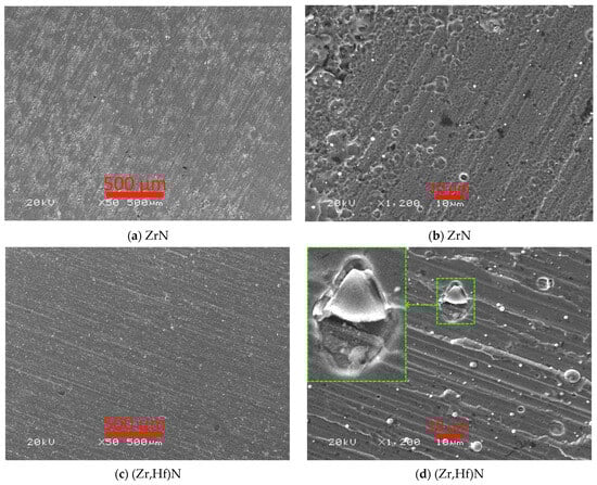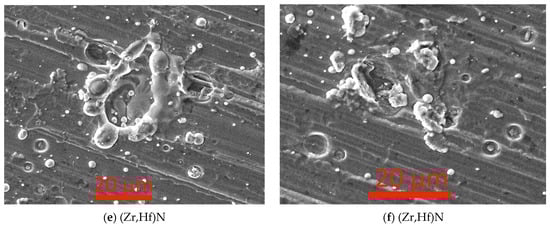 A moderate amount of microparticles can be observed on the surface of the ZrN and (Zr,Hf)N coatings, without significant structural defects (Figure 1). Furthermore, on the surface of the (Zr,Hf)N coating, there are local structural defects associated with the effect of microparticles on the coating (Figure 1d–f). The presence of such microparticles can be associated with the effect of the presence of hafnium [40], which is significantly heavier (atomic mass = 178.49) and refractory (melting point = 2233 °C) compared to zirconium (atomic mass = 91.22; melting point = 1852 °C) [53].