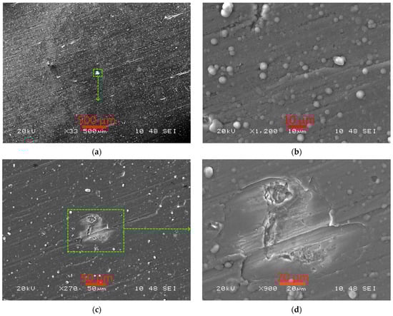 A significant number of spherical microparticles can be observed on the surface of the DLC coating (Figure 2a,b). A characteristic surface defect of this coating is potholes up to 100 μm in size (Figure 2c–f), the formation of which may be due to a high level of internal stresses in combination with the high brittleness of the coating [5,6].