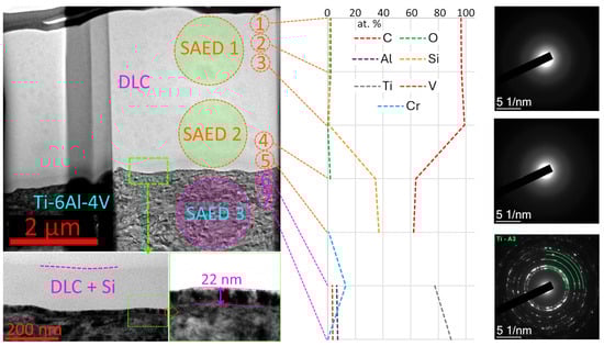 Selected area diffraction (SAED) studies reveal the presence of the Ti (A3) phase in the substrate and the amorphous structure of the DLC coating. The ZrN and (Zr,Hf)N coatings also have a thickness of approximately 4 μm.