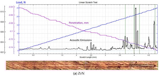 The results of scratch tests reveal the relatively high strength of the ZrN coating failure—the coating failure (point LC2) begins at a load of approximately 21 N, and the first signs of the onset of failure (point LC1) correspond to a load of approximately 16 N (Figure 4a). The nature of the failure of the ZrN coating can be attributed to the compressive tension failure type [54].