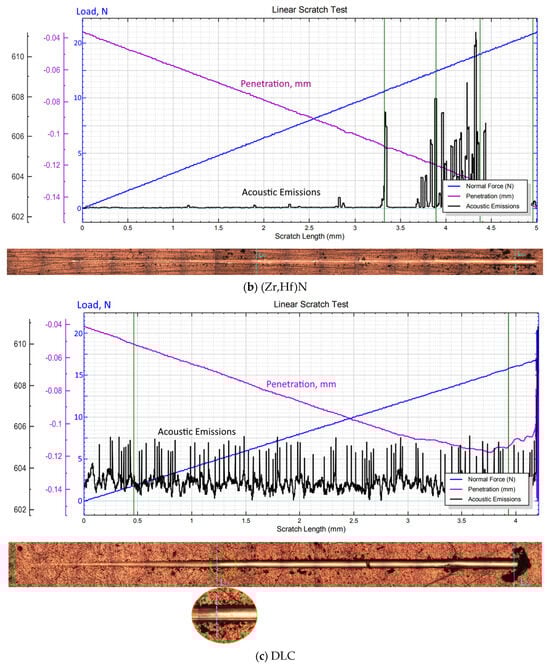 - During the scratch test, the DLC coating begins to break down even under small (from 6 N) loads via the spallation failure mechanism, while under large loads, the peeling off of large fragments of the coating can be observed. The breakage of the ZrN and (Zr,Hf)N nitride coatings occurs via a more plastic mechanism, and no noticeable peeling of the coatings is observed.