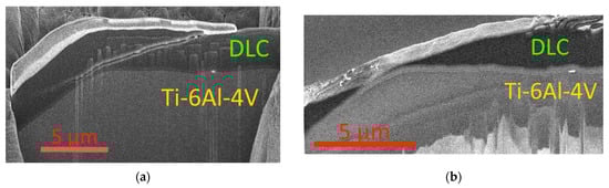 As depicted in Figure 5, the DLC coating failure at the scribing groove boundary involves the active formation of cracks cutting through the coating structure (Figure 5a). The dominant mechanism of the coating failure is brittle failure with the formation of chips.