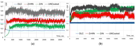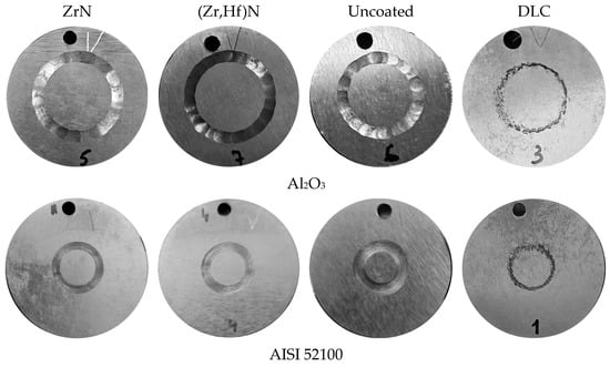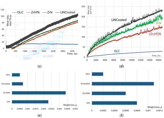 Figure 7a,b compare the tribological properties of the coated and uncoated samples in contact with the Al2O3 and AISI 52100 indenters. The DLC-coated sample shows the lowest coefficient of friction (COF) for both indenters. The low COF value for the DLC-coated sample compared to the nitride coatings has been noted in previous studies [55]. At the same time, the ZrN- and (Zr,Hf)N-coated samples display a noticeable decrease in the COF in contact with the Al2O3 indenter. However, when in contact with the AISI 52100 indenter, only the (Zr,Hf)N coating exhibits a decrease in the COF, while the ZrN-coated sample yields identical results to the uncoated sample. It is worth noting that when in contact with the AISI 52100 indenter, the ZrN-coated sample yields a lower COF value compared to the (Zr,Hf)N coating. A previously conducted comparison of the tribological properties of ZrN- and DLC-coated samples when in contact with various counterbodies (with different hardness values, from steel to diamond) revealed that in all cases, the ZrN-coated samples showed a significantly higher COF value [56]. Moreover, as the hardness of the counterbodies increased, the difference in the COF value initially increased and then decreased. In our case, a similar effect was observed—for the significantly harder Al2O3 indenter, the difference in the COF values between the ZrN- and DLC-coated samples is less than in the tribological pair with an indenter made of the softer AISI 52100 steel.