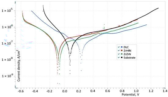 Superposition of potentiodynamic curves of the studied (Zr,Hf)N, ZrN, and DLC coatings on the surface of the Ti-6Al-4V alloy in 0.9% NaCl at 40 °C (Vp = 10 mV/s).