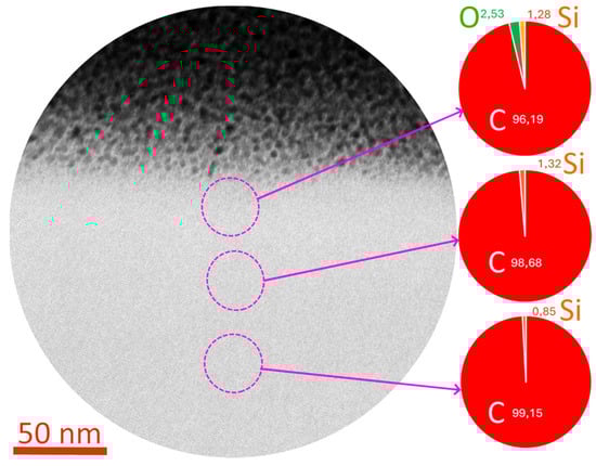 The surface morphology and structure of the coatings were studied using a Carl Zeiss (Oberkochen, Baden-Württemberg, Germany) EVO 50 scanning electron microscope (SEM), with an EDX system X-Max—80 mm2 (OXFORD Instruments, Abingdon, Oxfordshire, UK), and a transmission electron microscope (TEM), TEM JEM 2100 (JEOL, Tokyo, Japan). The elemental composition was studied using a TEM with EDX INCA Energy (OXFORD Instruments, Abingdon, Oxfordshire, UK). TEM samples were prepared using a focused ion beam (FIB) on a Strata 205 device (FEI Company, Hillsboro, OR, USA).