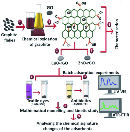 A schematic of the experimental design included the following steps: (1) Synthesizing graphene oxide (GO) from raw graphite flakes via oxidation via a modified Hummers method. (2) Obtaining the resulting GO. (3) Copper oxide-doped reduced graphene oxide (CuO–rGO) was synthesized from synthesized GO and an aqueous CuSO4·5H2O solution, and (4) zinc oxide-doped reduced graphene oxide (ZnO–rGO) was synthesized from synthesized GO and an aqueous ZnSO4·7H2O solution through a series of thermal chemical reactions. (5) The chemical and physical properties of GO, CuO–rGO, and ZnO–rGO were characterized via standard microscopic and spectroscopic techniques, including SEM, TEM, ATR-FTIR, and XPS. (6) Batch adsorption experiments were conducted to remove textile dyes (rhodamine 6G (R-6G) and malachite green (MG)) and antibiotics (amoxicillin (AMOX) and tetracycline (TC)) from aqueous solutions via GO, CuO–rGO, and ZnO–rGO adsorbents, followed by analysis via UV–visible spectroscopy. (7) Mathematical modeling and kinetics were applied to study the batch adsorption of textile dyes (R-6G, MG) and antibiotics (AMOX, TC) on GO, CuO–rGO, and ZnO–rGO. (8) Analyzing functional group changes on the GO, CuO–rGO, and ZnO–rGO adsorbents after adsorption of the textile dyes and antibiotics via ATR-FTIR. (Reproduced with permission from [99]).