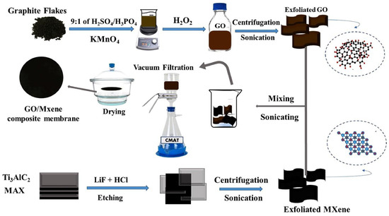 Diagrammatic representation of the synthesis process for free-standing graphene oxide (GO), Ti3C2Tx, and GO/Ti3C2Tx composite membranes (reproduced with permission from [101]).