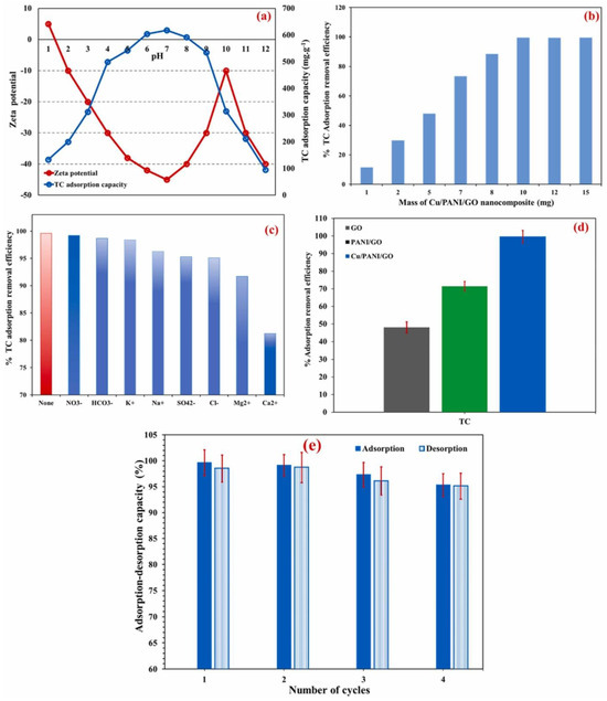 Influence of various factors on the tetracycline adsorption efficiency of the Cu/PANI/GO nanocomposite: (a) pH and zeta potential, (b) mass dosage (mg), (c) presence of interfering ions, (d) synergistic impact of Cu nanoparticles and polyaniline on the adsorption efficiency, and (e) reusability of the Cu/PANI/GO nanocomposite over four consecutive cycles under optimal conditions (reproduced with permission from [102]).