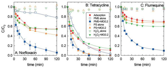 Removal of norfloxacin (A), tetracycline (B), and flumequine (C) via activated inorganic peroxides with magnetic graphene MG0.2 (reproduced with permission from [88]).
