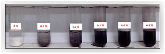 Photographs of carbon nanoparticle (CRF-6/600) dispersions in water at different concentrations (% p/v). Volume = 1 mL.