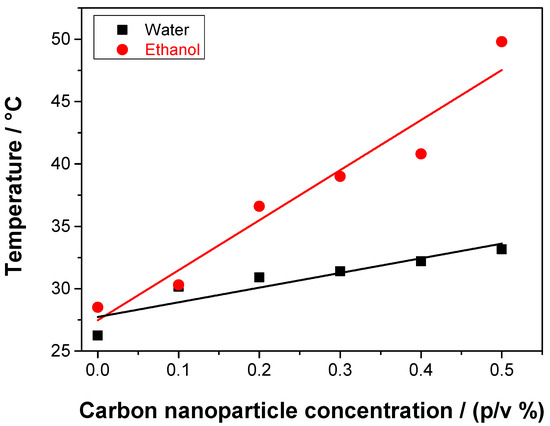 The colloidal dispersions are stable for days, likely due to the charges present in the spontaneously oxidized carbon surface of the nanoparticles. The photothermal measurements were made as described in the experimental part. The data collected during the experiments were temperature values of the medium in which the particles are suspended, as a function of time and concentration. These were taken in triplicate and average values were calculated. The results obtained for suspensions in water are graphed in Figure 2, while those corresponding to dispersions in ethanol are shown in Figure 3.