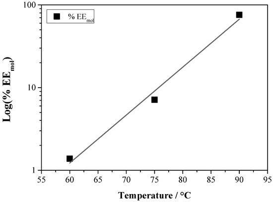 In order to analyze the effect that temperature has on the yield of the transesterification reaction of sunflower oil with EtOH, the values of the oil/alcohol molar ratio (1:20), stirring speed (1300 rpm), reaction time (5 h) and optimum amount of catalyst added (10% w/w with respect to the mass of oil). The amount of initial sunflower oil was kept fixed at 10 g, the volume of ethanol at 13.2 mL, and the temperature was varied. Experiments were carried out at 60, 75, and 90 °C. The catalyst used for the experiment was CRF 6/600/H2SO4/80. The results obtained are summarized in Table 5.