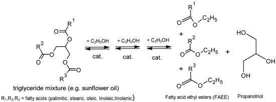 As can be seen (Scheme 1), the reaction occurs in three consecutive steps, and each one requires catalysis. Moreover, all reactions are reversible. To obtain a high conversion, the equilibria should be displaced to products. This is achieved by adding an excess of the alcohol (bioethanol).