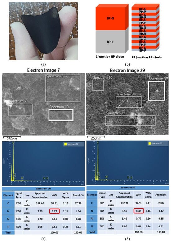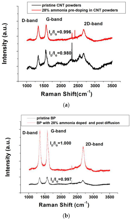 To observe the morphology and elemental composition of the ammonia-doped BP, we employed a field-emission scanning electron microscope (FESEM, JEOL JSM-7000F, JEOL Ltd., Tokyo, Japan) and performed elemental analysis using energy-dispersive X-ray spectroscopy (EDS, OXFORD X-ACT, Oxford Instruments Inc., Abingdon, UK). Furthermore, to investigate changes in surface defects and crystallinity of the CNTs after thermal doping, Raman spectroscopy (Andor BWII RAMaker SR-750, Andor Technology Inc., Belfast, Ireland) was performed using a 532 nm laser to scan BP samples mounted on glass slides.