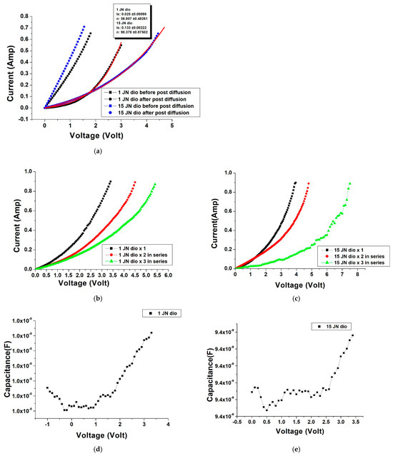 For the diodes fabricated in the initial process, the current–voltage (I-V) characteristics were measured using a Keithley 2400 source meter (Keithley 2400, Keithley Instruments Inc., Cleveland, OH, USA). The preliminary data indicated that the devices exhibited limited diode-like behavior, suggesting a weakly formed PN junction. To address this, we subjected both the single-junction diode BP and the 15-junction diode BP to a post-diffusion process. This involved placing the samples in a vacuum tube furnace at 600 °C for one hour to enhance the junction characteristics.