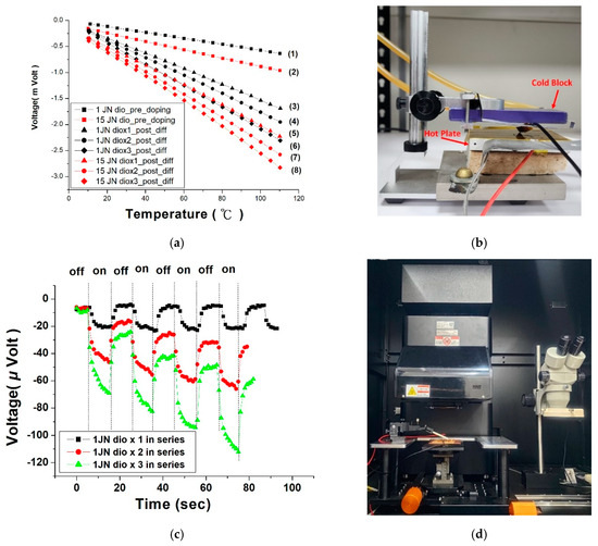 Thermoelectric voltage measurements were conducted using a temperature variation module coupled with a Keithley 2000 multimeter (Keithley 2000, Keithley Instruments Inc., Cleveland, OH, USA), while photovoltaic characteristics were evaluated using a solar simulator (A.M. 1.5G, LCS-100, Forter Tech. Ltd., Taichung, Taiwan) with an intensity of 1000 W/m2. Photovoltage outputs were recorded with the Keithley 2000 multimeter.