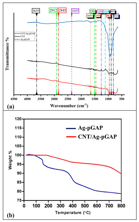 (a) FTIR spectrum of Ag-pGAP, CNT, and CNT-Ag-pGAP. (b) TGA graphs of Ag-pGAP and CNT-Ag-pGAP.