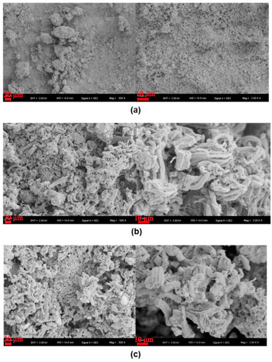 Figure 2 presents SEM images of the silver polyglutaraldehyde phosphate (Ag-pGAP), carbon nanotube (CNT), and CNT/Ag-pGAP compounds at various magnifications. The micrographs indicate that Ag-pGAP has an amorphous structure, with silver appearing as tiny particles (Figure 2a). In Figure 2b, the CNT structures are clearly visible with smooth surfaces, showcasing their pristine morphology. In contrast, the SEM image of the CNT/Ag-pGAP composite (Figure 2c) retains the CNT structures but shows a clouded and less defined surface compared to Figure 2b.