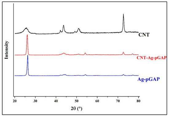 XRD spectra of Ag-pGAP, CNT, and CNT/Ag-pGAP.