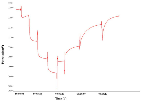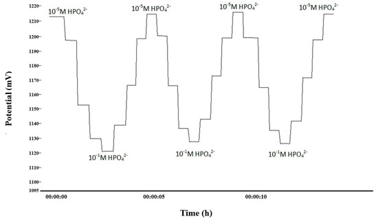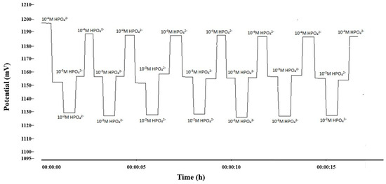 To measure the response time of the composite phosphate-selective electrode prepared with Ag-pGAP for Composition 2, the transition times to reach the equilibrium potential were examined in standard HPO42− solutions within the concentration range of 1.0 × 10−1 to 1.0 × 10−5 M. The response time graph of the composite phosphate-selective electrode is shown in Figure 7. It was observed that the response time of the electrode, which exhibited repeatable and linear responses to standard HPO42− ions in the concentration range of 1.0 × 10−2 to 1.0 × 10−4 M, was particularly less than 15 s, especially as the concentration increased towards higher concentrations.