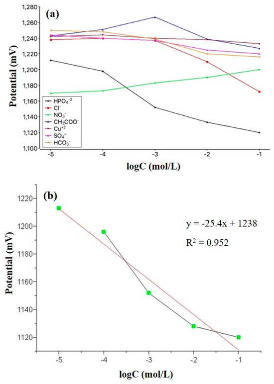 As shown in Figure 5a, the composite phosphate-selective electrode prepared using Composition 2 demonstrated specific sensitivity to HPO42− ions, as well as to Cl⁻, CH3COO−, Cu2+, SO42−, HCO3−, and NO3− ions. To better understand the selective behavior of the composite phosphate-selective electrode, selectivity coefficients were calculated. For this purpose, standard HPO42− solutions ranging from 1.0 × 10−1 to 1.0 × 10−5 M were prepared. The potential changes exhibited by the composite phosphate-selective electrode in response to these HPO42− solutions were analyzed, and calibration curves were plotted using the obtained data. From the calibration curve, a linear equation was derived. Subsequently, the same electrode was employed to measure the potential changes in different standard anion solutions, including sodium and potassium, at concentrations ranging from 1.0 × 10−1 to 1.0 × 10−5 M. Selectivity coefficients were calculated based on the potential changes in each anion and the linear equation derived from the calibration curve. The calibration curve used for calculating selectivity coefficients is illustrated in Figure 5b.
