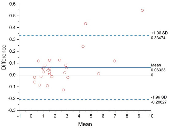 In Table 3, the mean and standard deviation values of the data obtained through both measurement methods are very close to each other. The relevant data sets were initially subjected to the Bland–Altman method using the Origin program, and graphs depicting the deviations of the observed values from the mean were obtained, as shown in Figure 8.
