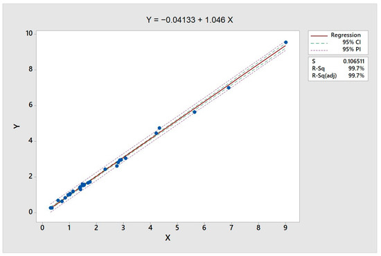 Upon reviewing Figure 8, it is evident that the differences in the measurement results obtained by the two techniques do not exhibit a systematic distribution around the mean, but instead display a random distribution. According to the Bland–Altman method, the mean of the differences should be dispersed around zero. Therefore, using the Bland–Altman method, it was appropriate to assess the agreement between these two methods. The analysis indicated that there was an agreement between the two methods, and they could be considered as alternatives to each other. The results of the regression analysis of the relevant data sets are depicted in Figure 9. For the values, the fact that 99.7% of the variation in either of the two methods could be explained by the other method (R2) served as an indicator of the agreement, and the linearity ratio was also utilized to express the agreement.