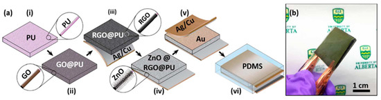 - Li, X.; Chen, Y.; Kumar, A.; Mahmoud, A.; Nychka, J.A.; Chung, H.-J. Sponge-Templated Macroporous Graphene Network for Piezoelectric ZnO Nanogenerator. ACS Appl. Mater. Interfaces 2015, 7, 20753–20760. [Google Scholar] [CrossRef] [PubMed]