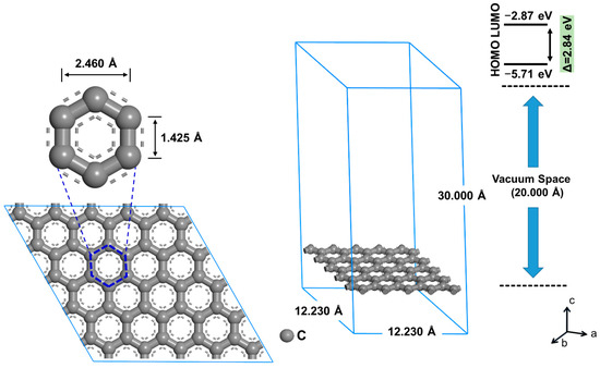 We constructed the surface structure of graphene as depicted in Figure 1, where atomic positions were refined by performing the geometry optimization [47,48]. We designed 2 × 2 supercells of graphene surfaces (12.230 Å × 12.230 Å) as shown in Figure 1. We fixed the vacuum thickness (the size of the unit cell in the direction perpendicular to the slab–slab connections) to 20.000 Å for all calculations. The dimensions for the initial computational models of the graphene were 12.230 Å × 12.230 Å × 30.000 Å. To analyze the electronic effect of k-point sampling on the structure and energy, various k-point samplings for the Brillouin zone were implemented using the 4 × 4 × 1 Monkhorst–Pack method [49]. The k-point was set to 4 × 4 × 1 to improve the accuracy of calculation and the actual space was set to less than 0.03 Å−1. Spin-polarization and dipole corrections were also incorporated into the calculations. The adsorption energies () of graphene and graphene oxide were defined by Equation (1):