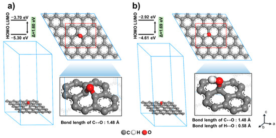 The charge-transfer rates were determined by comparing the Mulliken atomic charge method and Hirshfeld method for obtaining direct and convincing estimation, because the numbers of electrons in atoms in a molecule (AIMs) are not observable quantities, one must compare different population analysis schemes indirectly, using a combination of chemical concepts [50,51]. Graphene oxide was considered to consist of epoxide (GRO) and hydroxyl (GROH) oxidation functional groups. We introduced each group to the pristine graphene as Figure 2. As the results of the geometry optimization for graphene oxides (Figure 2), the initial bond length between C-O for the epoxy group in graphene oxide is 1.48 Å (Figure 2a), and for the hydroxyl group in graphene oxide, the initial bond length between C-O and H-O is 1.48 Å and 0.58 Å, respectively (Figure 2b).
