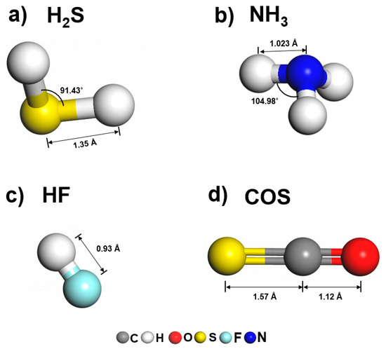 We geometry-optimized the selected pollutants by classifying two asymmetrical molecules (H2S and NH3) and two linear molecules (HF and COS) and the initial bond lengths and angles for each structure are shown in Figure 3. The initial distances between the adsorbates and the adsorbents are set to 3.000 Å to figure out the affinity between graphene and graphene oxide surfaces. H2S and NH3 form weak interactions due to their asymmetric structure and relatively low electronegativity difference, while HF and COS form strong electronic interactions due to their linear structures and high electronegativity differences.