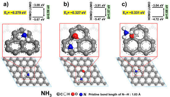 Figure 5 shows the adsorptive configuration of NH3 on graphene and graphene oxides. In terms of binding energy, entire binding energies between graphene and graphene oxides with NH3 were higher (less stable) (from 0.279 eV to −0.331 eV) than those with the other gases and the values are in line with the previous study [53]. And by introducing functional groups, we found that binding energies increased and the band gaps were narrowed compared with the NH3 adsorption with pristine graphene. From the initial bond length of 3.00 Å between NH3 and the surface, the graphene oxide with an epoxy group showed the shortest bond length among the three structures. NH3 is an asymmetrical molecule with a trigonal pyramidal structure, and the central nitrogen atom has a free electron pair. This free electron pair acts as an electron donor and can provide electrons to form stronger interactions with the oxygen functional groups of graphene oxide.