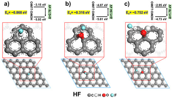 Next, we investigated the adsorptive characteristics of HF, as shown in Figure 6. Interestingly, binding energy results showed that HF geometry optimized more stable with pristine graphene than graphene oxides. HF is a highly polar molecule, and charge transfer and interactions can occur when it is adsorbed on the surface of a structure. Pristine graphene has a relatively simple and regular structure than graphene oxides; therefore, HF molecules may be more stably adsorbed to the surface. However, the band gap and bond length results showed that the interaction between structure and HF has enhanced by introducing an epoxy group or hydroxyl group. Furthermore, bond lengths between functional groups and HF are shortened under 2.00 Å, while the bond length between pristine graphene and F atom of HF was extended (3.07 Å) compared to the initial bond length. Due to the high electronegativity of the F atom, the interaction with graphene is weakened, and F movers slightly away from graphene and is arranged perpendicular to the graphene surface for stabilization. The vertical arrangement of HF allows the H atoms to form strong local interactions, but the F atoms are far away, limiting their influence on the overall electronic structure. Therefore, Figure 6a shows the high binding energy but a wide band gap.