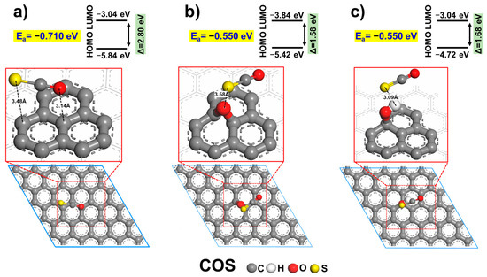 Adsorptive configuration of COS on (a) graphene, (b) graphene oxide with epoxy group (GRO) and (c) graphene oxide with hydroxyl group (GROH).