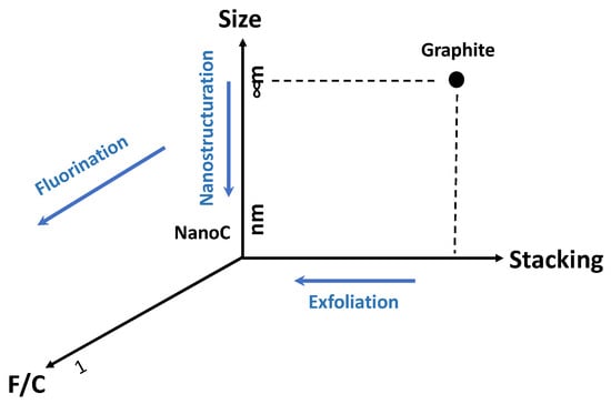 Solid lubricants are described as materials that are intentionally introduced or formed on the contact surfaces in relative motion in order to decrease friction and wear, providing protection from damage [1]. They are then widely used in modern industries such as automotive, aerospace, and aviation. Material shaping, metallurgy, and machining industries are other applications where lubrication plays a key role. Very severe operating conditions are often found, such as elevated temperatures, ultrahigh vacuum, heavy loads, extreme radiation, and chemical reactivity environments [2]. Such conditions drive the research for the development of new lubricants. Dry and chemically immobilized lubrication is expected to be an alternative to traditional wet lubricant oils. In such a context, fluorinated carbons or CFx appear as key materials. Fluorination of carbonaceous materials decreases the surface energy and reduces the micro-wear on an atomic scale. Graphite fluorides (GFs) have been well-known for a long time as excellent solid lubricants. GFs burnished on stainless-steel disks exhibit lower friction coefficients and wear than graphite and MoS2, especially at temperatures around 400 °C [3,4]. GFs exhibit extreme plasticity within lubricated contact [2]. The effect of humidity on the tribological properties of GFs is lower than that of graphite or MoS2 [2]. The oxidation in air of covalent GFs starts above about 450 °C, and low molecular weight fluorocarbons are then altered. However, fluorinated carbons cannot be applied under aqueous environments due to their high hydrophobicity. Whereas petroleum cokes have low lubricating ability, fluorinated cokes exhibit good tribological properties. Nevertheless, those properties are lower than the ones of GFs and fluorinated graphitic carbons (both with equivalent results) [5], evidencing an effect of the structural order. Those GF characteristics represent the state-of-the-art, which needs to be surpassed by taking advantage of the versatility of both the fluorination of carbonaceous (nano)materials and their exfoliation, starting with fluorinated precursors. Better-performing CFx-based solid lubricants allow severe friction conditions to be addressed. In the present review, different strategies to enhance the tribological properties of CFx will be discussed. Figure 1 summarizes most of them. The change of the fluorine content, x in CFx (x = F/C molar ratio), will be discussed first. The decrease of the stacking via exfoliation of GFs or fluorination of graphene-type materials is another route to enhance the lubricating properties as well as the use of nanometric CFx.