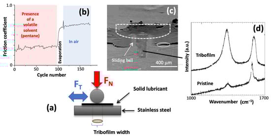 Ball-on-plane reciprocal tribometer (a) and representative examples of the evolution of the friction coefficient according to the presence of a volatile solvent (b), aspect of the wear scar obtained at 100 cycles of friction (c), and evolution of the Raman spectra during friction (d).