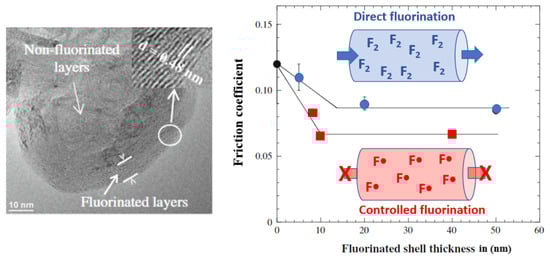 Correlation between the thickness of the fluorinated shell (obtained from TEM; a representative example is given on the left side) and friction coefficient according to the fluorination method, either with molecular fluorine (direct) or atomic fluorine (controlled). Arrows show the region of interest or magnification.