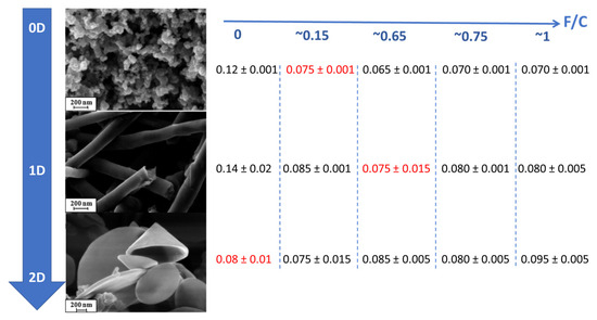 Fluorinated carbon structures exist with different dimensionalities, and their properties are correlated directly to the size of the material used. 0D (fluorinated spherical carbon blacks) [22], 1D (fluorinated nanotubes, nanofibers) [21,42], and 2D (fluorinated graphene, fluorinated nanodiscs) [10,19,23,43,44] exist, having their own properties and applications. The fluorinated materials discussed here, i.e., 0D fluorinated spherical carbon blacks [22], 1D fluorinated nanotubes, nanofibers [21,42], and 2D fluorinated nanodiscs [23,44], exhibit similar covalent C-F bonding and closed structures at a given fluorination rate [44] that allows their tribological properties to be compared. The shape factor of fluorinated nanocarbons influences the tribological properties of the material. As shown in Figure 5, when the F/C ratio exceeds 0.15, the incorporation of fluorine atoms into the carbon lattice facilitates easy cleavage in graphitized carbon blacks (GCBs) and carbon nanofibers (CNFs). On the contrary, no improvement in friction coefficients was noted for nanodiscs after fluorination, likely due to the excellent tribological properties of the non-fluorinated initial material. The flat morphology with a large diameter/thickness ratio strongly induces an orientation of the nanodiscs parallel to the sliding surfaces. Moreover, their extended graphitic structure with a c-axis perpendicular to disc faces seems to induce easy cleavage along sliding directions parallel to the disc surfaces.