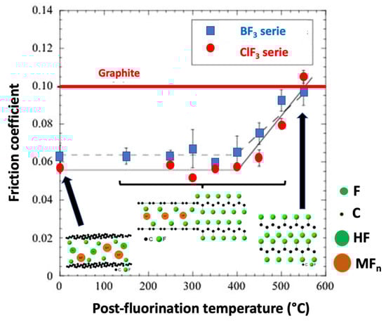 The intrinsic tribologic properties of the tested graphite fluorides clearly demonstrate that the friction reduction process is not directly related to the fluorine content or the fluorination-induced interlayer distance expansion, as the friction coefficients appear the highest for the greatest F/C ratios and interlayer distances. All the raw and post-fluorinated RTGFs present good intrinsic friction properties, better than pristine graphite (Figure 6). The lowest friction coefficients were obtained for low and intermediate post-fluorination temperatures as μ remained in the same range of 0.055–0.06. For RTGFs post-fluorinated at temperatures higher than 450 °C, an increase of μ was observed (0.09–0.1).