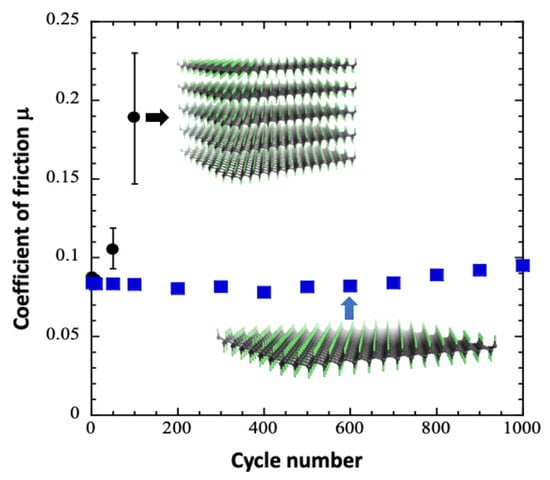 Using fluorinated graphene obtained from the thermal exfoliation of graphite fluoride (exGF) for tribological analysis, comparing the material directly to its un-exfoliate equal is needed. As shown in Figure 7, fluorinated graphene exhibits low variations in its friction coefficients, staying at 0.08 as the cycle number increases [19]. Exfoliation and defluorination occurred simultaneously during the thermal shock, resulting in exGF with low fluorine content, i.e., with a composition close to CF0.05 starting from CF1. It is important to note that, despite the massive defluorination, the excellent lubricating performances did not deteriorate because of the weakening of the interparticle interactions due to the exfoliation process. Exfoliated structure may facilitate the formation of a homogeneous and stable tribofilm even if the fluorine content is low.