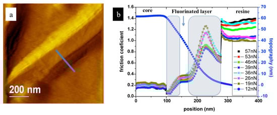 Thomas et al. [21] have measured the intrinsic friction properties of fluorinated carbon nanofibers by AFM. The F/C molar ratio was 0.15 (from NMR data). TEM measurement allowed them to determine that the core was constituted of numerous randomly oriented graphitic domains, and fluorine atoms were only present in the external shell, whose thickness ranges between 30 and 40 nm. Figure 9a,b show respectively the AFM topographic image of fiber cut by FIB and the topographic profile correlated to the friction coefficient evolution as a function of sliding distance. A friction coefficient of 0.20 ± 0.05 was measured for the graphitized core, whereas the friction coefficient of the fluorinated surrounding shell is 0.35 ± 0.05. The highest friction coefficient was recorded outside the fiber on the embedding resin.