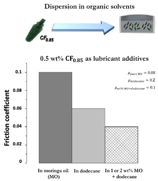 Lubricating oil additives have been extensively explored for friction and wear-reduction properties. Many studies investigated the use of fluorinated carbon particles as lubricant additives. Fluorinated graphene (FG) as an additive has high efficiency due to its small size, high strength, and layered structure [26]. Ci et al. showed that a higher ratio of covalent C-F bonds improves the chemical stability of highly fluorinated reduced graphene oxide (HF-rGO), limiting the release of fluorine atoms [66]. Chen et al. showed that for the optimum addition of 1 wt% of FG in poly α-olefin base oil, the average reduction of friction coefficient was 12.3%, and the wear rate decreased by 87% compared to pure PAO6 (Poly Alpha Olefin) [63]. The FG nanosheets quickly entered the sliding contact and mainly participated in the lubrication film formation. Nomede-Martyr et al. worked with fluorinated carbon nanofibers (CF0.85) and moringa oil as lubricant additives in dodecane [34]. They showed that fluorination enhanced the lubricating performances of carbon nanofibers. In the presence of CF0.85, the friction coefficients are similar, whatever the percentage of moringa oil added in the blend, compared to pristine carbon nanofibers ones (Figure 10).