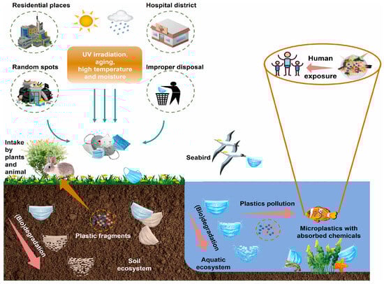 Landfilling is the most common global waste management strategy, but it is unsuitable for plastic waste due to several issues. Additives like antioxidants and stabilizers prolong plastic biodegradation, leading to long-term persistence. Landfilling also faces challenges such as limited space, slow degradation rates, resource wastage, and health risks from groundwater contamination caused by toxic chemicals leaching from landfill sites. Additionally, disposable PPE waste contributes to environmental pollution through the release of microplastics (MPs) resulting from physical and chemical degradation [14]. These MPs pose significant threats to aquatic and terrestrial ecosystems, as well as human health (Figure 3), further emphasizing the need to minimize reliance on landfilling for plastic waste management. Table 1 presents the environmental impacts associated with processing post-consumer face masks using conventional management approaches. It provides a detailed comparison of key factors such as greenhouse gas emissions, pollutant release, and resource consumption, underscoring the challenges and inefficiencies of landfilling in managing PPE waste sustainably.