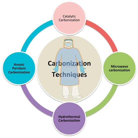 The carbonization technique is also one of the thermochemical processes where the conversion process of PPE wastes into carbon-based materials occurs when undergoing heat treatment with high temperatures in an inert atmosphere [11]. There are two main steps in this technique, which are pyrolysis and carbonization. The carbonization process is often somewhat similar to the pyrolysis process, but the material or PPE wastes are initially prepared with an additive. The carbonization usually takes place in very high temperatures ranging between 150 °C and 1500 °C [13]. Carbonization can be divided into four categories: pressure carbonization, catalytic carbonization, hydrothermal carbonization, and anoxic pyrolysis carbonization [12,40]. The carbonization process needs a very high temperature ranging between 150 °C and 1500 °C [13]. Several parameters also need to be optimized for this technique in order to achieve high-quality carbon-based materials, such as temperature, pressure, time duration, type of chemical activation, and catalyst. Furthermore, less complex stages are needed for the carbonization process, making it affordable, environmentally friendly, controllable, and energy-efficient. It also can yield a considerable amount of carbon with further catalytic or sulfonation modification procedures [48]. However, because of the tiny size and structural limitations of raw materials, this process typically yields micron-sized rather than submicron-sized carbon materials.